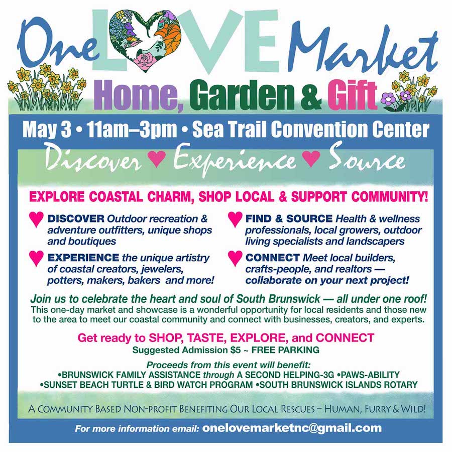 Founded in 2020, One LOVE Market is a community-based nonprofit organization that provides seasonal venues and events within South Brunswick County where the local community and visitors can explore coastal charm, connect and shop with local artisans, specialty shops, growers and other non-profit organizations that support community causes. Proceeds benefit local food banks and animal rescues — human, furry, and wild — making every event a celebration of local love and giving back.Celebrate