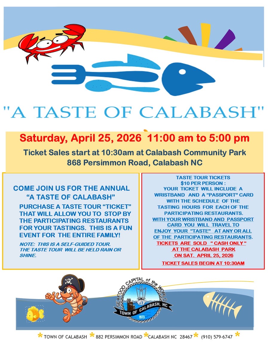 Join the nearby town of Calabash NC for the 10th Annual A Taste of Calabash Festival on April 25, 2026 from 11:00am – 6:00 pm. The town proudly assumes the title of the Seafood Capital of the World for its famous Calabash-style seafood.